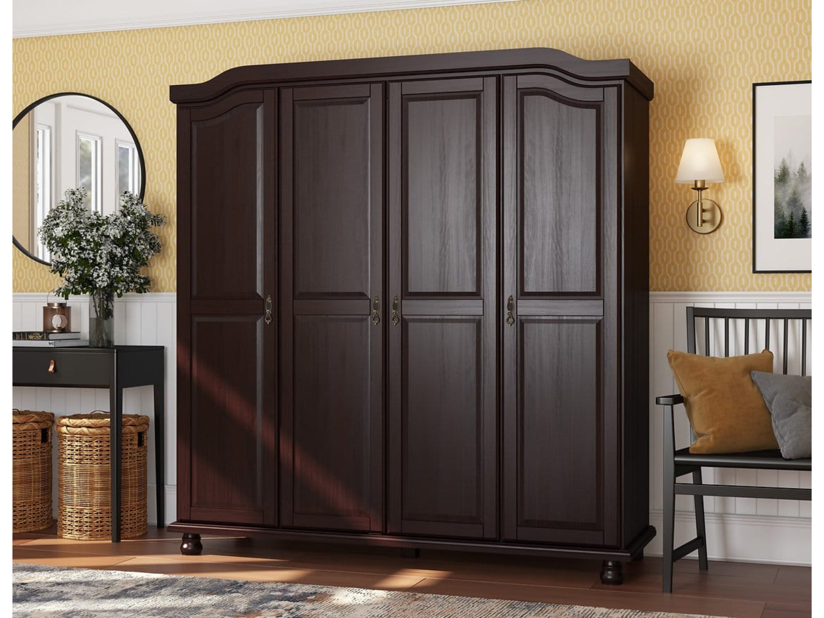 100% Solid Wood Kyle 4-Door Wardrobe with Mirrors With Optional Shelves